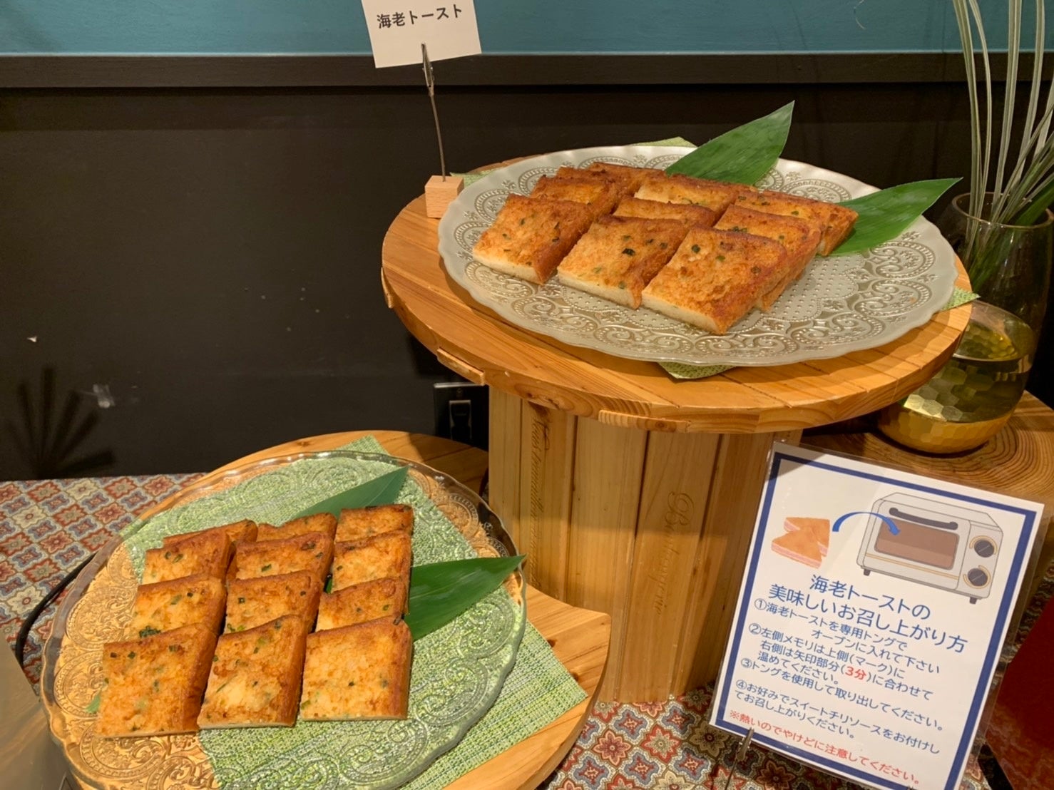 既存のビュッフェメニューにプラスして、人気のグリーンカレー、豚肉・筍のうま味が詰まったレッドカレー、イエローカレー3種と、ミルフィーユやタルト、杏仁豆腐やムース、ワッフル、ココナッツデザートなど苺をテーマにしたデザートビュッフェがお楽しみいただけます。また新商品として、自分で焼く“海老トースト”も登場します。