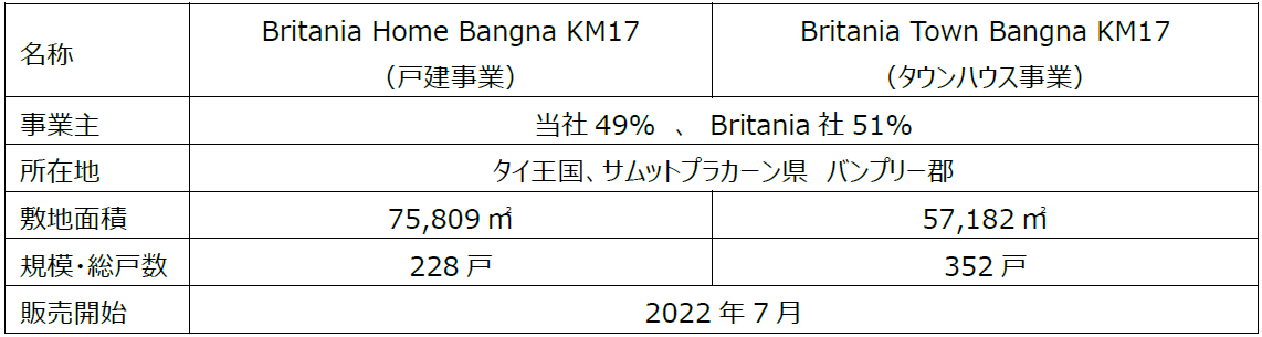 野村不動産株式会社(東京都新宿区/代表取締役社長:松尾 大作、以下当社)は、当社タイ現地法人を通じてタイ大手不動産会社「ORIGIN PROPERTY PUBLIC CO.,LTD. 」(以下、Origin 社)」の子会社「BRITANIA PUBLIC CO.,LTD.」(以下、Britania 社)」とタイ・バンコク首都圏において戸建・タウンハウス分譲事業に参画いたします。これまでOrigin 社グループとコンドミニアム事業及びサービスアパートメント事業計16 件の共同事業を行ってまいりましたが、戸建・タウンハウス事業への参画は初となります。