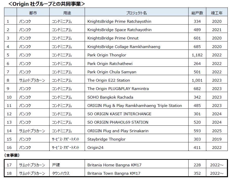 当社は2017 年からOrigin 社グループとコンドミニアム事業14 件、サービス・アパートメント事業2 件に参画し、タイにおける多数の事業実績を積み重ねる中で、相互の関係性強化に努めてまいりました。今般、更なる両社の発展を目指してOrigin 社と戦略的提携合意書を締結し、タイにおける不動産開発事業の協力体制を強化・拡大してまいります。Origin 社は当社に優先的に事業機会を紹介し、商品企画・設計・建設管理・販売等においては双方の知識・経験を共有しながら事業の価値向上に努めることを確認しております。