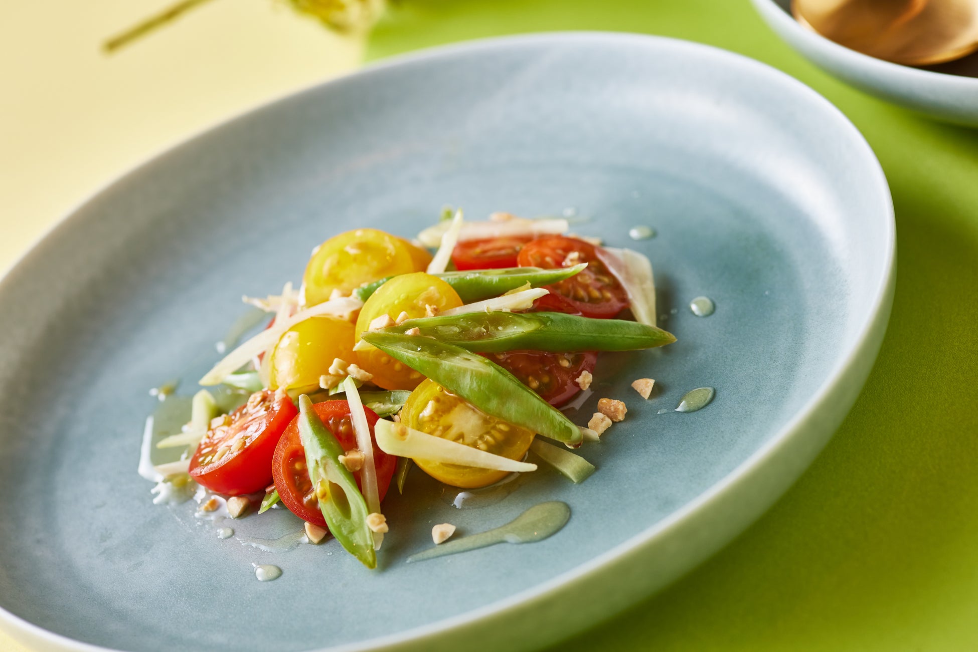 タイ料理が専門の森枝 幹シェフが考案したのは、魚醤と柔らかな酸味のカカオパルプジュースで仕上げたドレッシングを添えた、青パパイヤとエビのサラダ。カカオニブの食感がアクセントになっています。サラダにドレッシングをかけて、軽く容器を振って混ぜてからお召し上がり下さい。