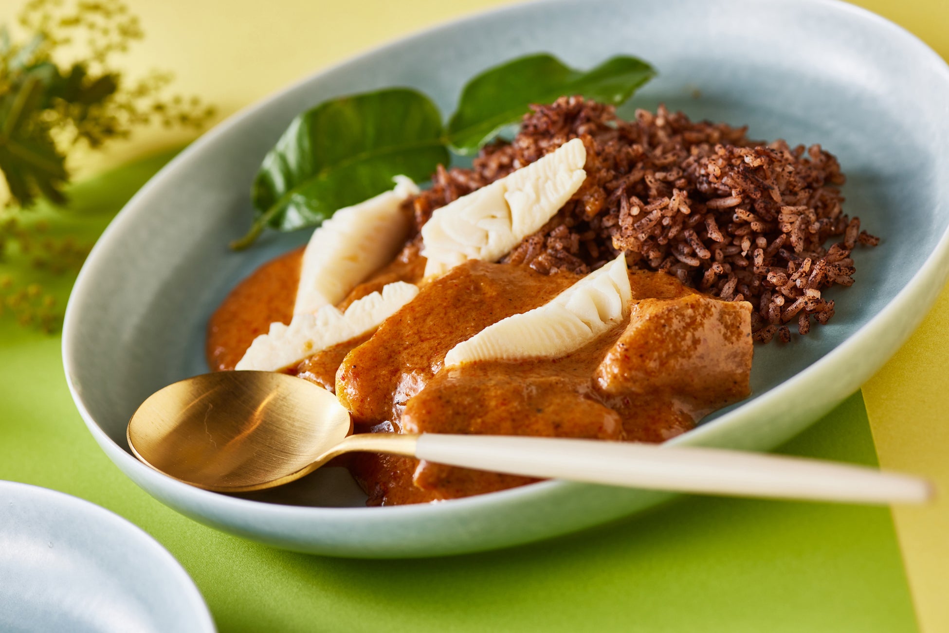 ベトナム料理が専門の内藤千博シェフが考案したのは、カカオのコクとカカオパルプの柔らかな酸味に、筍と若鶏をあわせたカカオカレー。程よい苦味と食感のあるカカオニブを混ぜたジャスミンライスの甘味が、カレーによく合います。