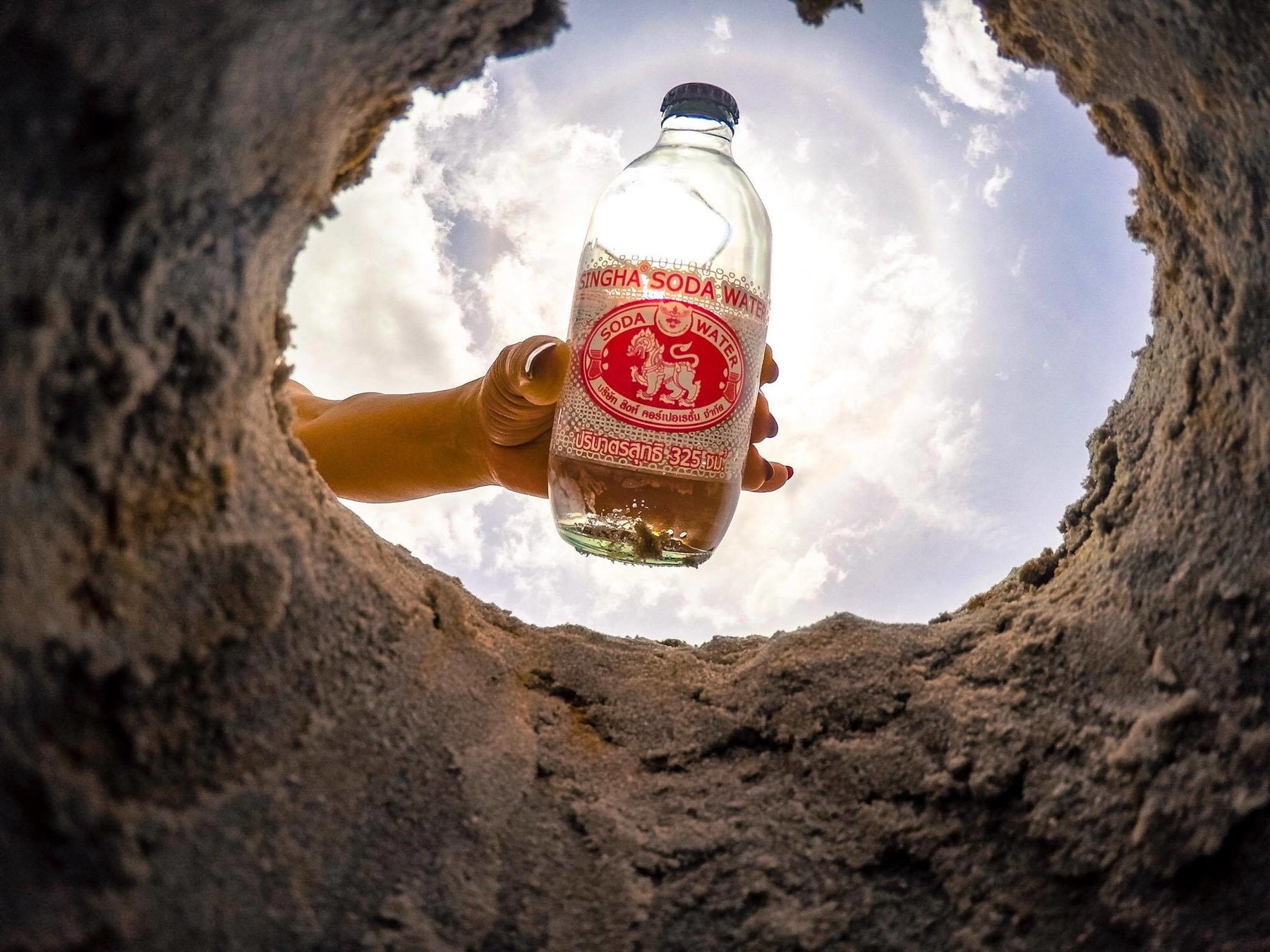 SINGHA SODAは、強炭酸を閉じ込めた丸い形の瓶が目印。SINGHAと一緒に冒険に出かけよう。