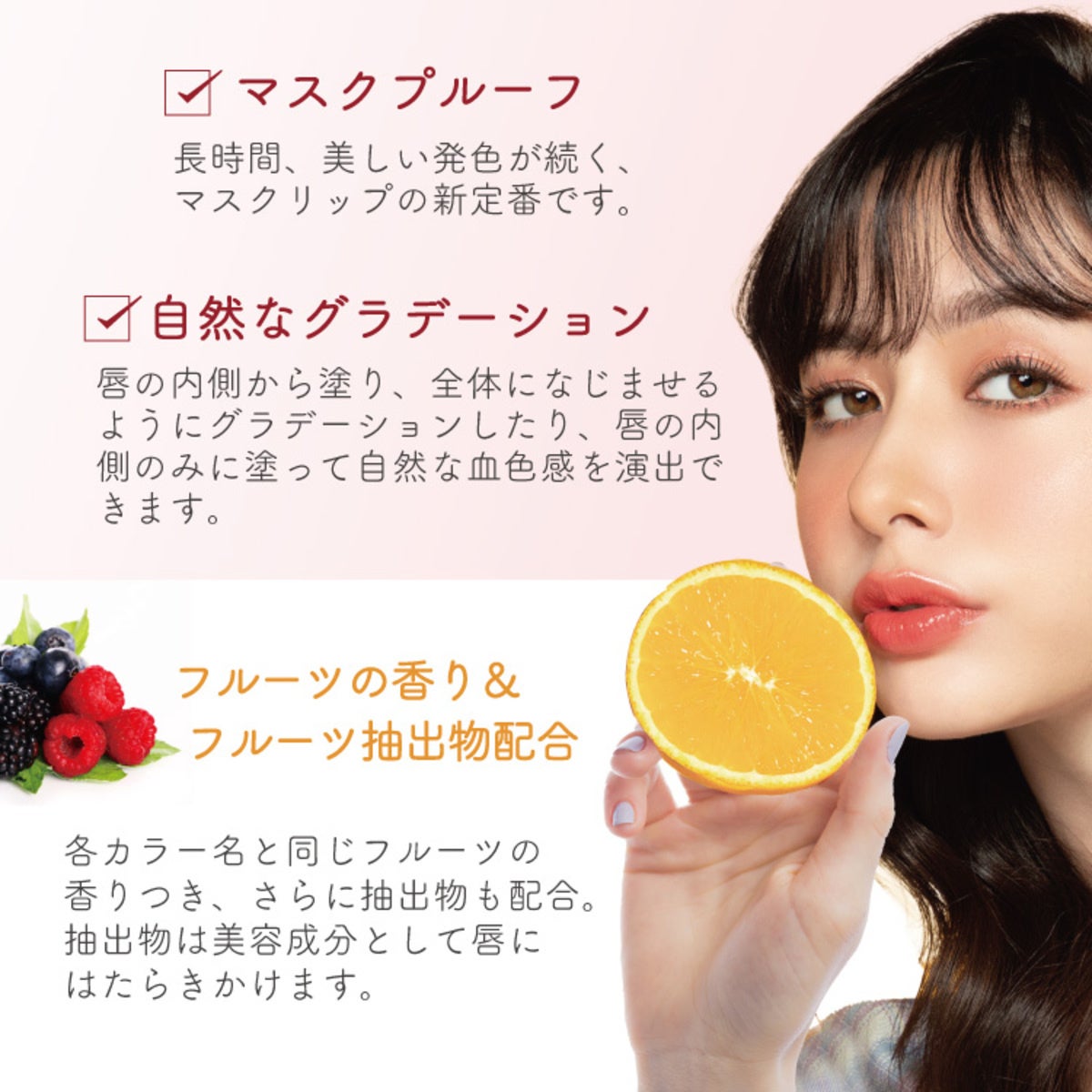 タイで発売後わずか3ヶ月で35万本以上もの売上を記録。マスクにつきにくいマスクプルーフ仕様。ビタミンCで唇をケアする、92%以上の天然水とフルーツエキスから生まれた、果汁感ウォーターティントリップが新登場。2色を混ぜ合わせて自分だけの色も作れるカクテルティントです。