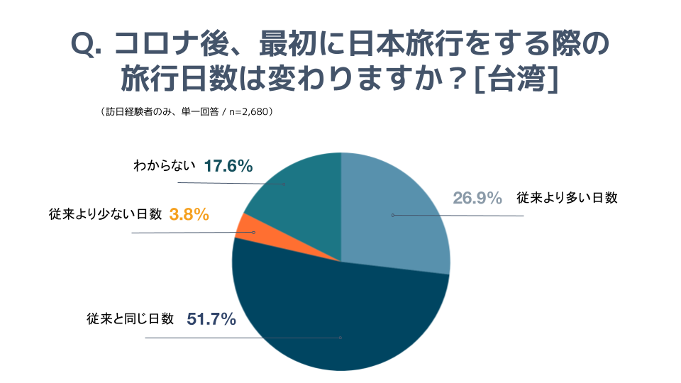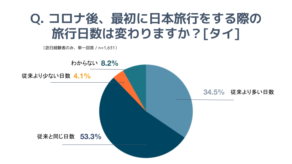 コロナ後の日本旅行の「日数」に関する質問の結果、訪日経験者で「従来より多い日数」と回答した方は台湾人で26.9%、タイ人で34.5%となりました。一方「従来より少ない日数」と回答した方は台湾人で3.8%、タイ人で4.1%とわずかで、「日数」を増やす意向が圧倒的に多い結果となっています。コロナ後のトレンドとしてこれまでよりも「旅行日数」を伸ばすことが予想されます。