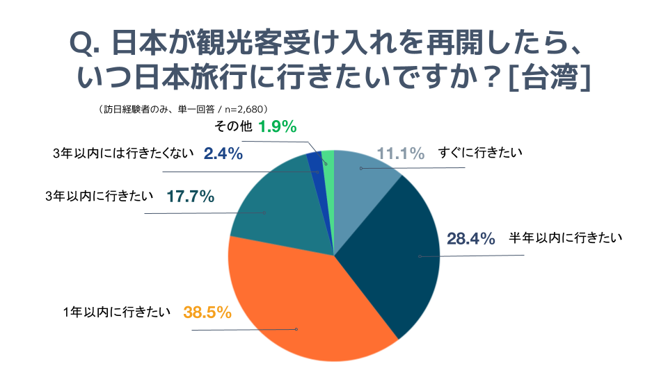 - 日本が観光客受け入れを再開したら「1年以内に行きたい」と考えている台湾人は約8割、タイ人では9割以上!