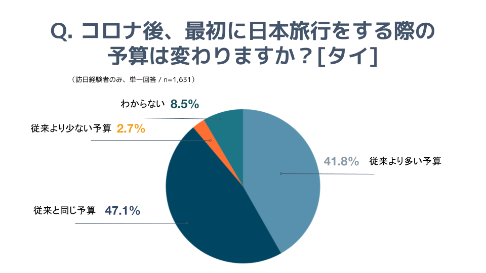 コロナ後の日本旅行の「予算」に関する質問の結果、訪日経験者で「従来より多い予算」と回答した方は台湾人で39.9%、タイ人で41.8%とどちらも4割近い結果になりました。一方「従来より少ない予算」と回答した方は台湾人で2.5%、タイ人で2.7%とわずかで、「予算」を増やす意向が圧倒的に多い結果となっています。どちらの市場もコロナ後の訪日旅行に関しては、今までと同水準もしくは増加の予算になる人が8割を超え、コロナ後のトレンドとしてこれまでより「旅行予算」を増やすことが予想されます。