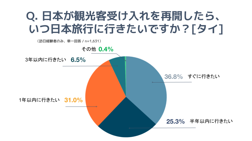 また、特にタイ人では「すぐに行きたい」と回答した数が36.8%「半年以内に行きたい」との合計で62.1%に上り、訪日旅行再開後より早い段階で日本旅行に行きたいと考えていることが分かる結果になりました。
