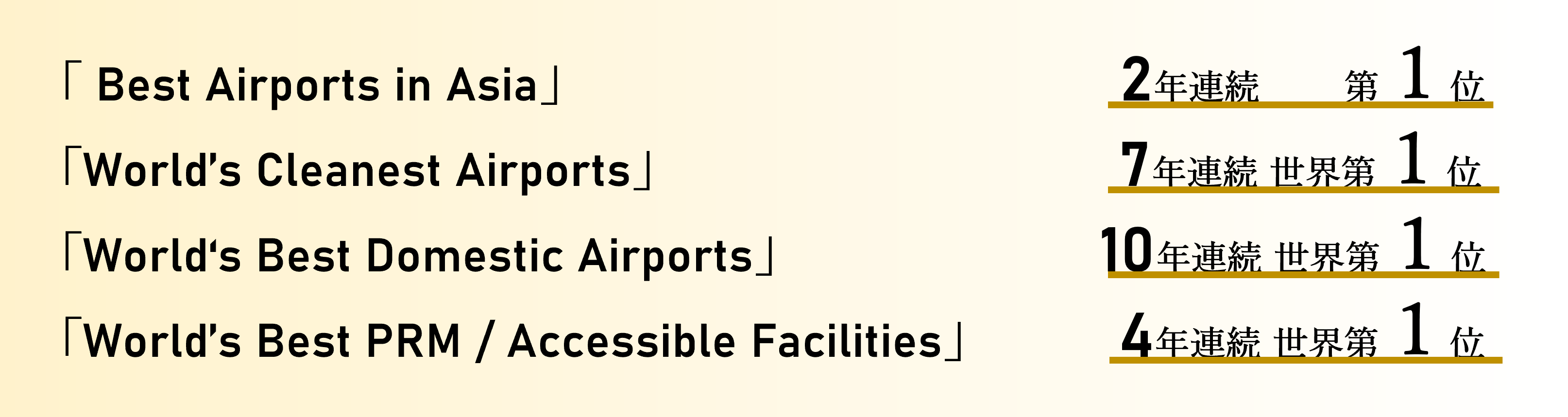 アジア空港の総合評価である「Best Airports in Asia」部門で2年連続第1位、空港の総合評価である「World’s Best Airports」部門においては、4年連続で世界第2位を獲得しました。