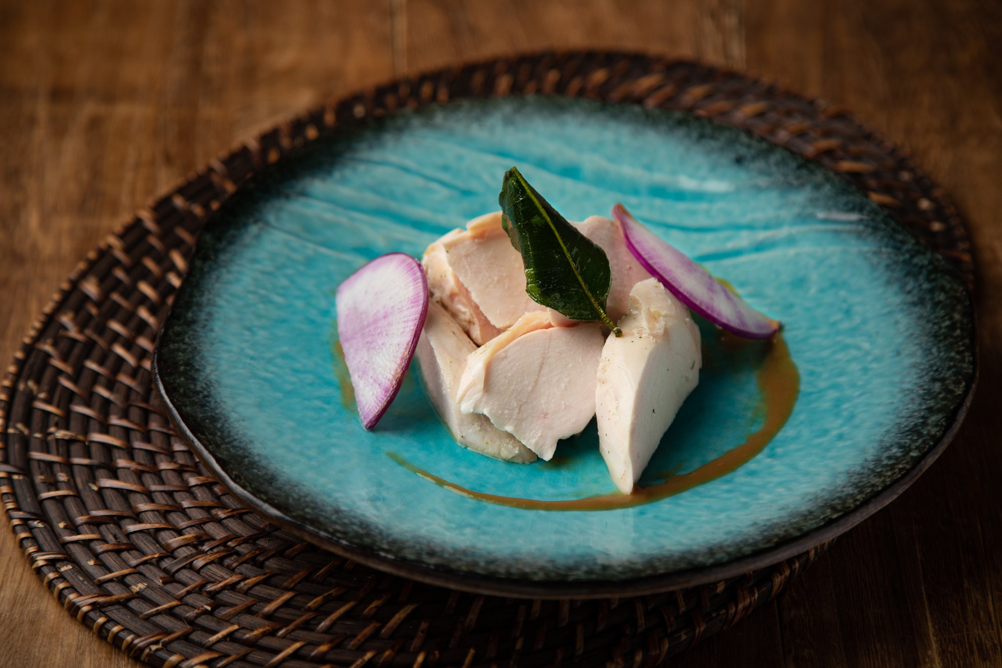 バイマックルでマリネした大山鶏は、低温料理する事で柔らく、ジューシーな味わい。発酵豆を使用したタイチオソースが鶏肉をよりアクセントに仕上げております。