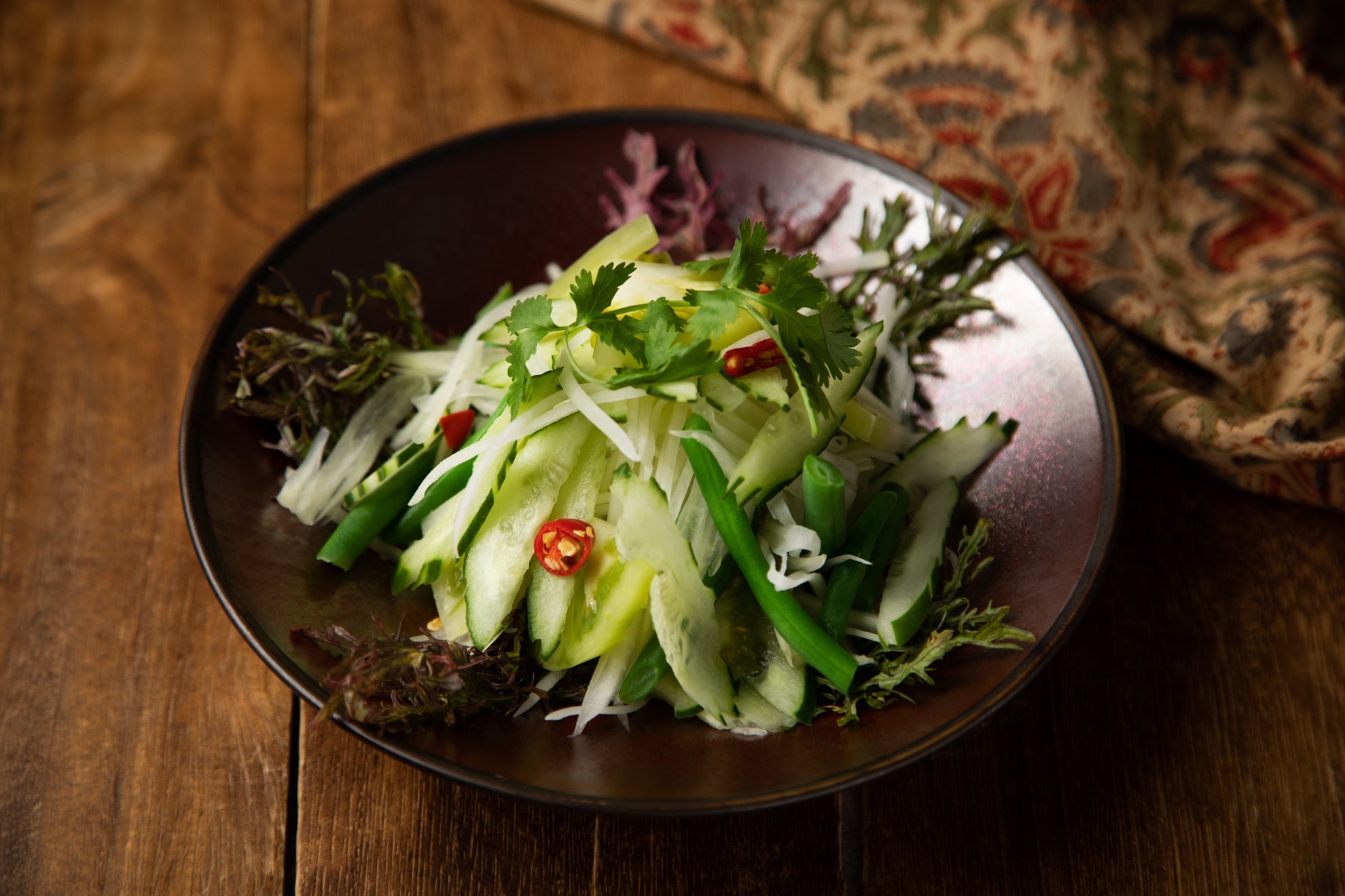 青トマトやパパイヤに生トウモロコシ、オクラ等の夏野菜を入れ、程よい辛さのピキーヌで仕上げる事で辛さと彩りが付いたソムタムに仕上げました。発酵させた海老味噌は隠し味として使用
