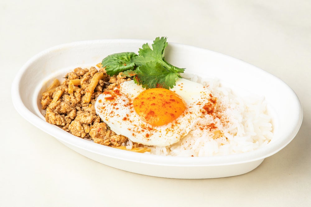 エスニック料理の定番・ガパオライス!鶏挽肉とホーリーバジルをナンプラー、オイスターソースで炒めたタイの定番料理です。
