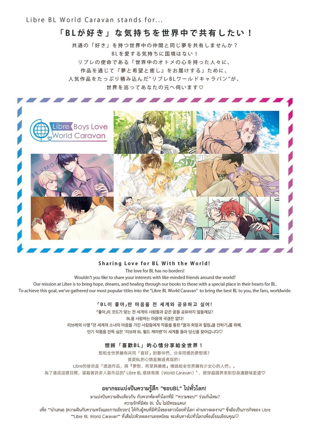 リブレの使命である「世界中のオトメの心を持った人々に、作品を通じて『夢と希望と癒し』をお届けする」ために、人気作品をたっぷり積み込んだ”リブレBLワールドキャラバン”が、世界を巡ってあなたの元へ伺います♡