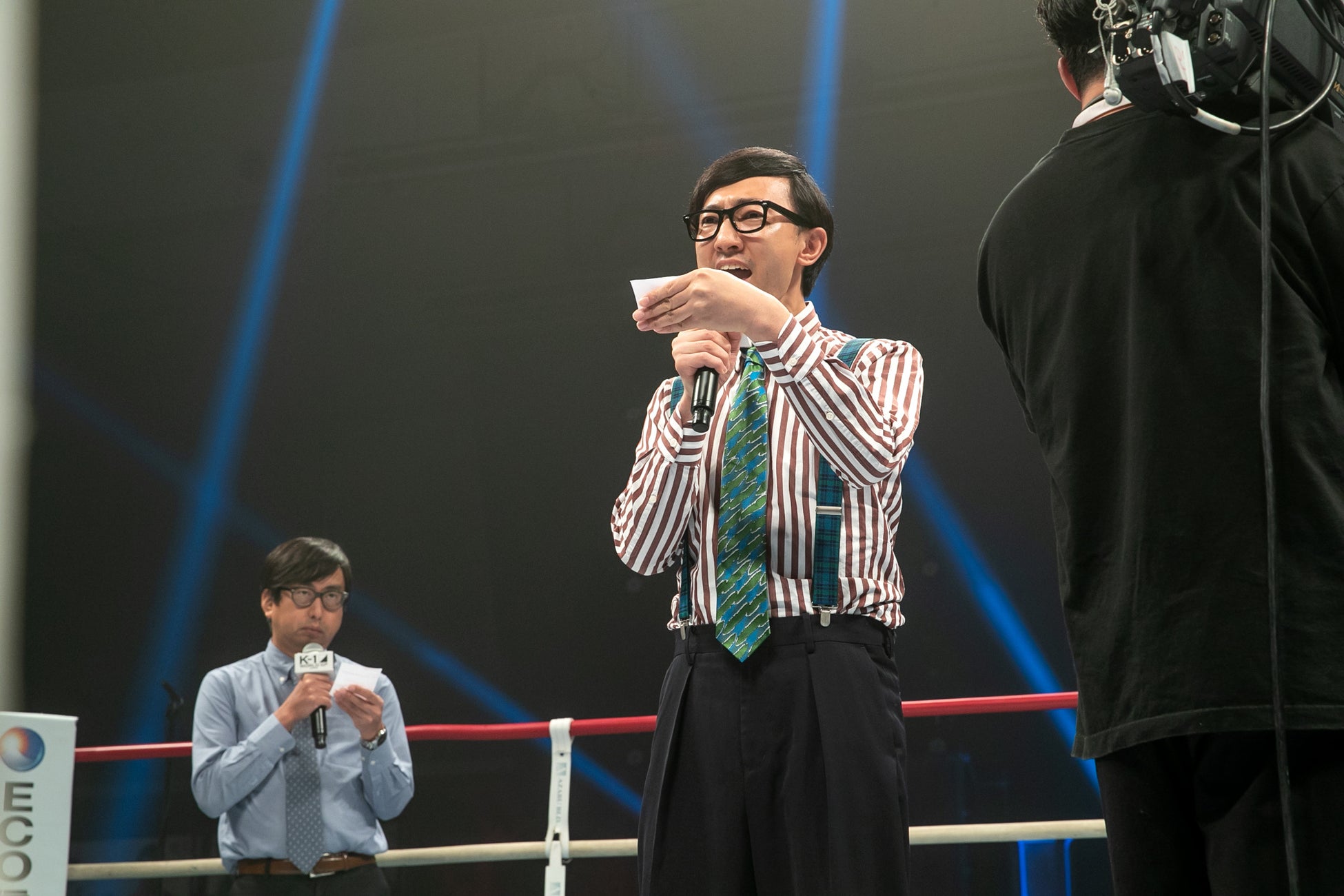 おいでやすこがさんには、第15試合バンタム級のキーパーソンの一人であり、福岡県嘉穂郡出身の壬生狼一輝とK-1本戦初出場の峯大樹の一戦にて、K-1スペシャルリングアナとして登場し注目の一戦を盛り上げました。