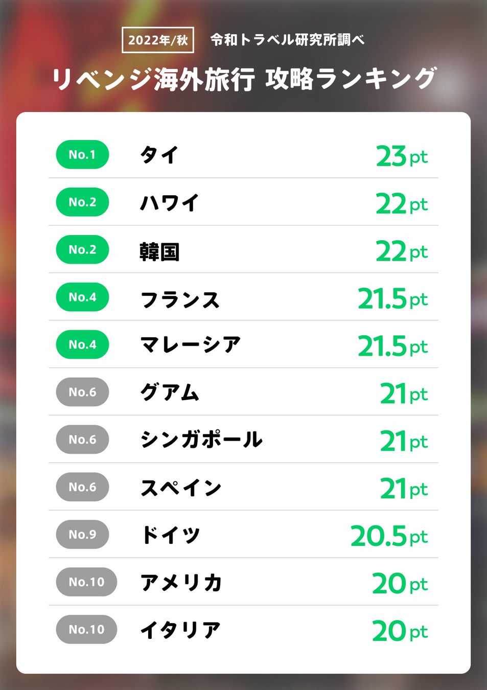 公式note【調査】9/7〜日本入国規制緩和!リベンジ海外旅行 攻略ランキングをご覧ください。