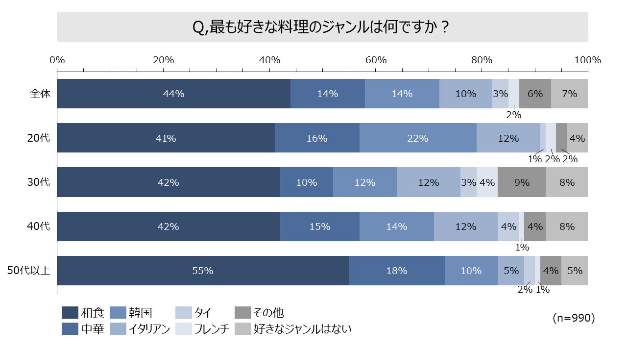最も好きな料理のジャンルは「和食」となりました。食べ慣れており、ほっとするという回答が目立ち、自国の料理を多くの方が愛しているようです。2位は「中華料理」でした。日本人にも親しみがあり、濃い味付けで白米と合うから好きという回答も多くありました。3位の「韓国料理」は特に20代と辛いもの好きな方を中心に支持されています。弊社が実施した「コロナ禍の辛いものについての調査」(https://www.j-roi.com/news/research/research-220330.html)でも明らかになっている通り、辛い料理には根強い人気が伺えます。
