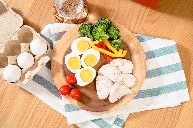 鍋でサラダチキンを作りながら蒸しトレイにブロッコリーやオクラなどの野菜、卵をセットすれば約30分でチキン、蒸し野菜、ゆで卵の3品が完成!低糖質・高たんぱくな3点セットは、筋トレやダイエット中の方に特におすすめです。