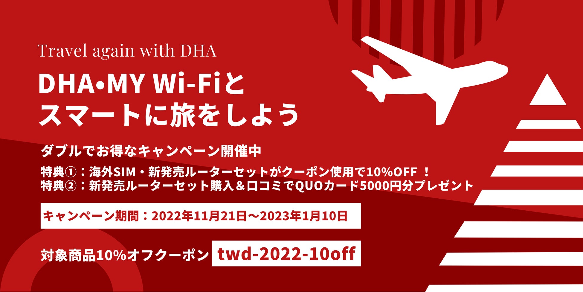 さらに海外旅行再開を祝し、海外旅行応援キャンペーン ≪Travel again with DHA≫を同時開催。公式オンラインストア内すべての海外用SIMに加え、新発売 ≪DHA Wi-Fi ルーターセット≫ が10%オフと、ダブルでお得なこのチャンス。⼿続きいらずで設定楽々、海外でも⽇本でも、ずっと使えてストレスフリーな MY Wi-Fi 。冬の海外旅⾏シーズンに向け、スマートな旅の新しい選択肢として検討されてはいかがでしょう。