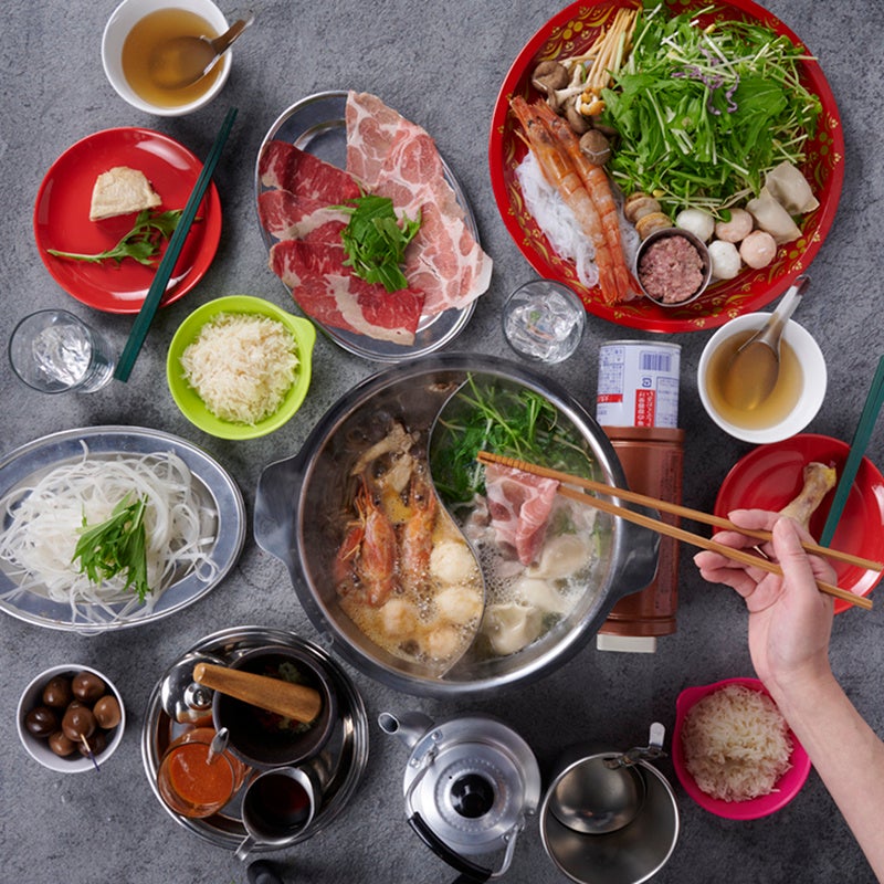 タイの鍋「タイスキ」。定番の鶏スープと、トムヤムスープまたは牛スープの2つの味が楽しめます。たっぷりの野菜とキノコ類、魚介やつみれ、ラムと豚のしゃぶしゃぶをナムチムスキーと呼ばれるタイのつけダレや、ライムナンプラー、ニンニクと唐辛子を擦り潰した薬味とつけダレで召し上がって頂きます。鍋の最後の〆メニューは、小さなカオマンガイをひつまぶしのように楽しめるニューハノイのオリジナルスタイルです。