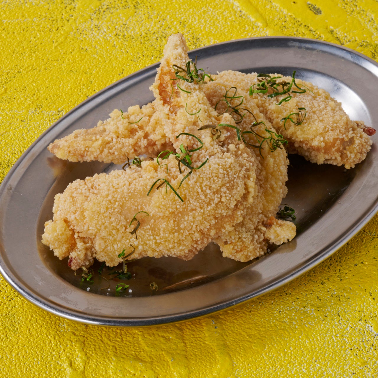 通常の粉とサツマイモデンプンを合わせてサクッとした食感の手羽先フライ。刻んだバイマックルと塩、辛痺の毛沢東スパイス、アニスの香りの五香粉スパイスの3種からを選べます。