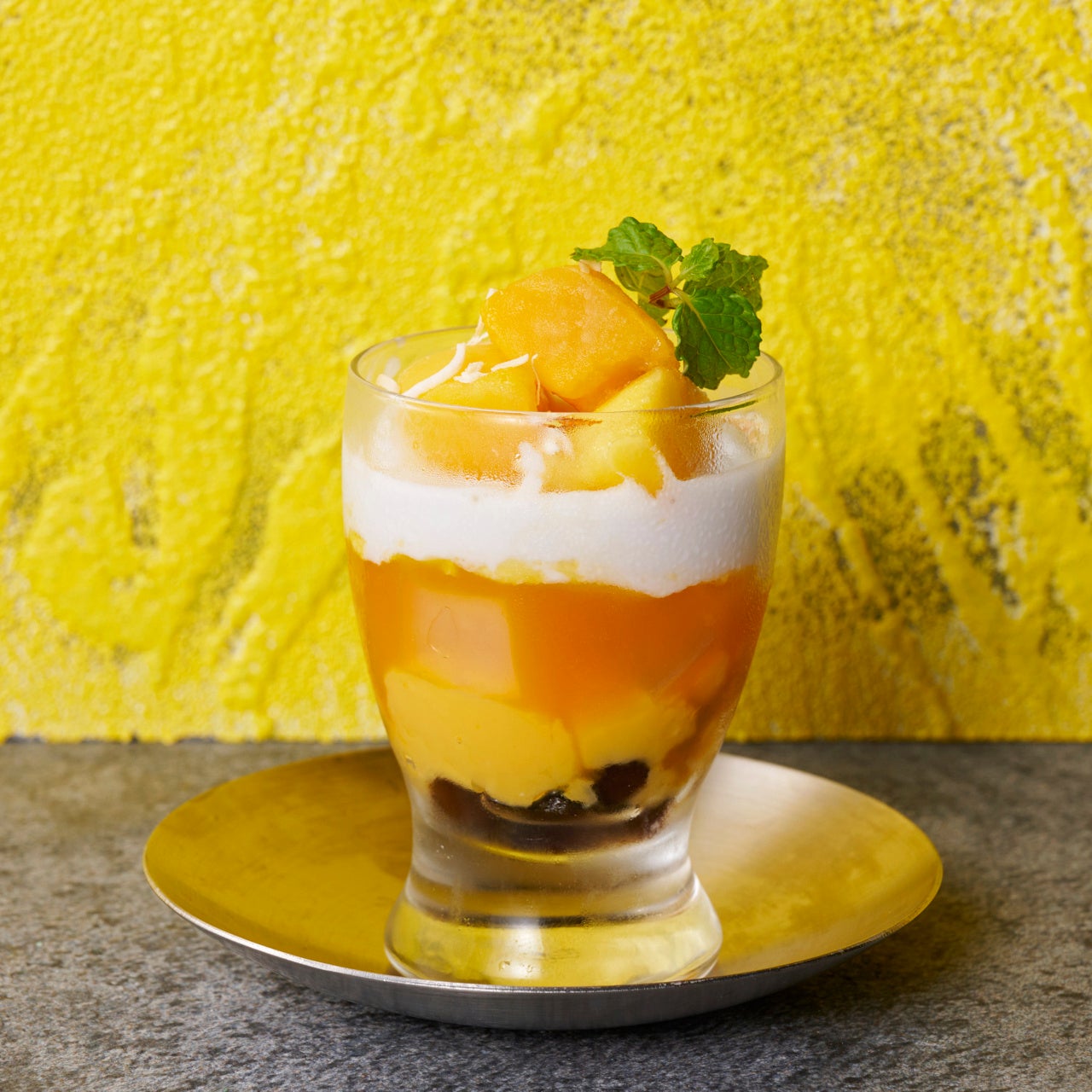 ベトナムの国民的デザートのチェー。マンゴープリンにマンゴー果実、ココナッツアイスをのせて、見た目もかわいいミニパフェ風に仕上げました。