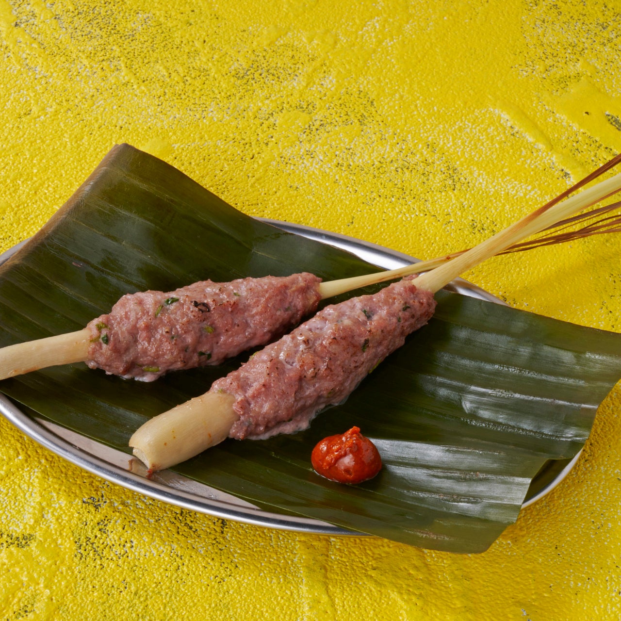 ラム挽肉に刻んだレモングラスを加え、さらにレモングラスに巻き付けて焼いたアジアンつくね。唐辛子ペーストをベースにした特製ハリッサを付けるとより風味がアップ!