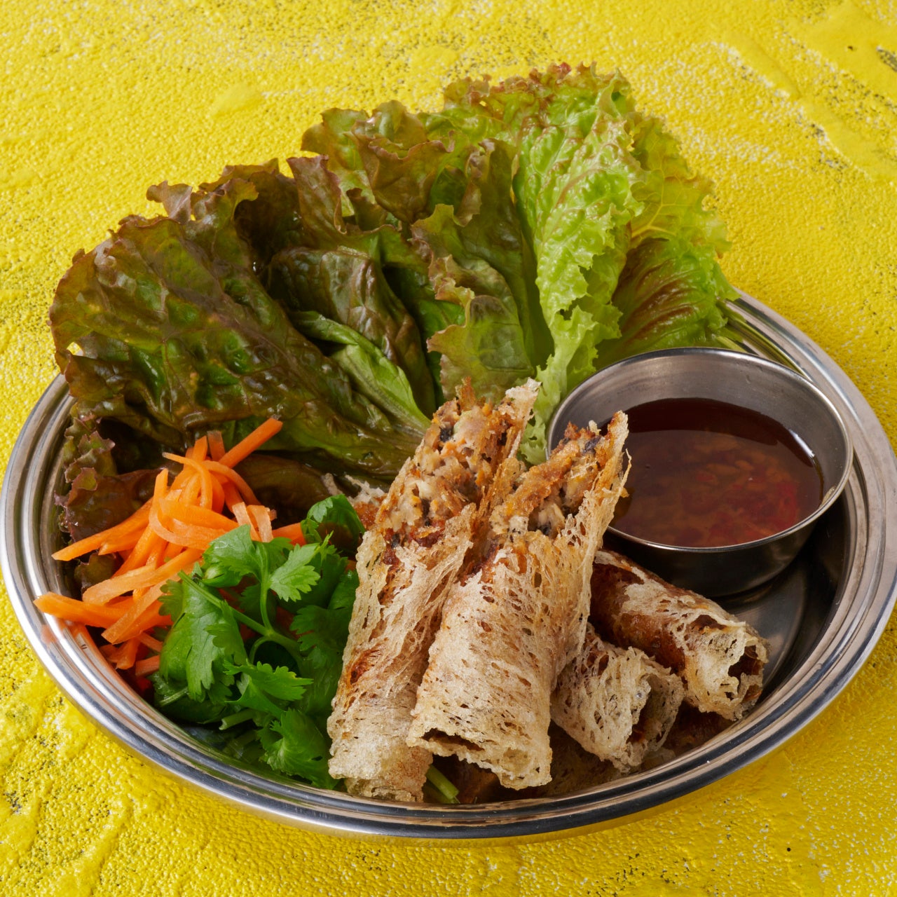 網状のライスペーパーで包んで揚げた春巻きをレタスや人参ナマスと共に巻き、自家製ヌクチャムソースで食べるヘルシーな一皿。