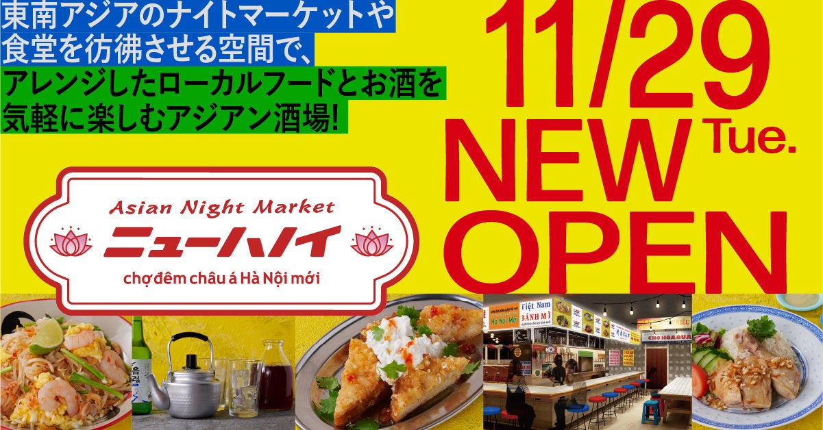 この度、当社はアジアン酒場『Asian Night Market ニューハノイ』を11月29日(火)に横浜駅西口より徒歩3分の立地にオープンいたします。東南アジアのナイトマーケットや食堂を彷彿させる雰囲気の店内で、タイやベトナムを中心としたアジアの代表的な料理やローカルフードをお酒と共に気軽に楽しめるアジアン酒場です。
