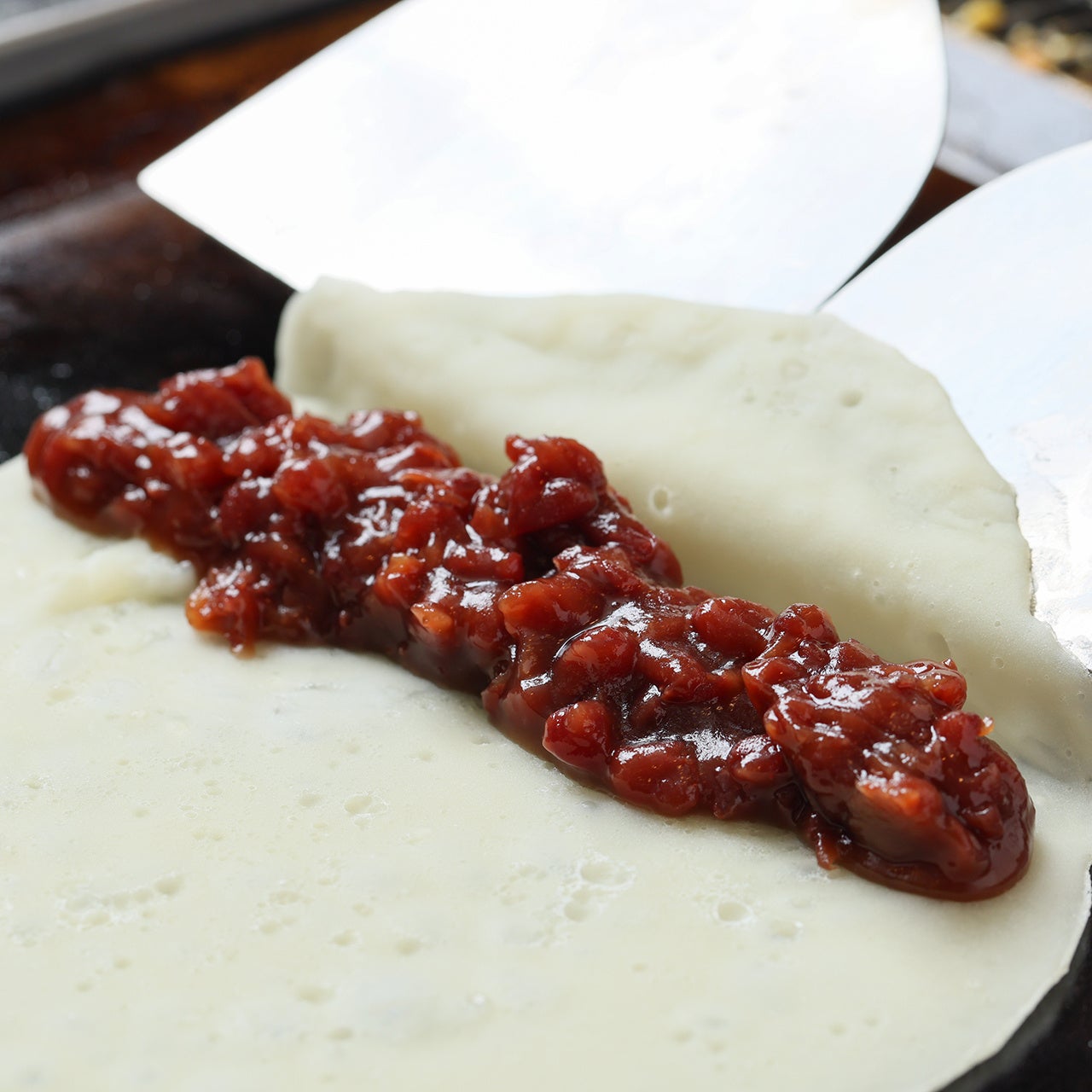 もんじゃ屋の定番の甘味。お客様ご自身で作る熱々デザート。アイスクリームをのせると更においしい!
