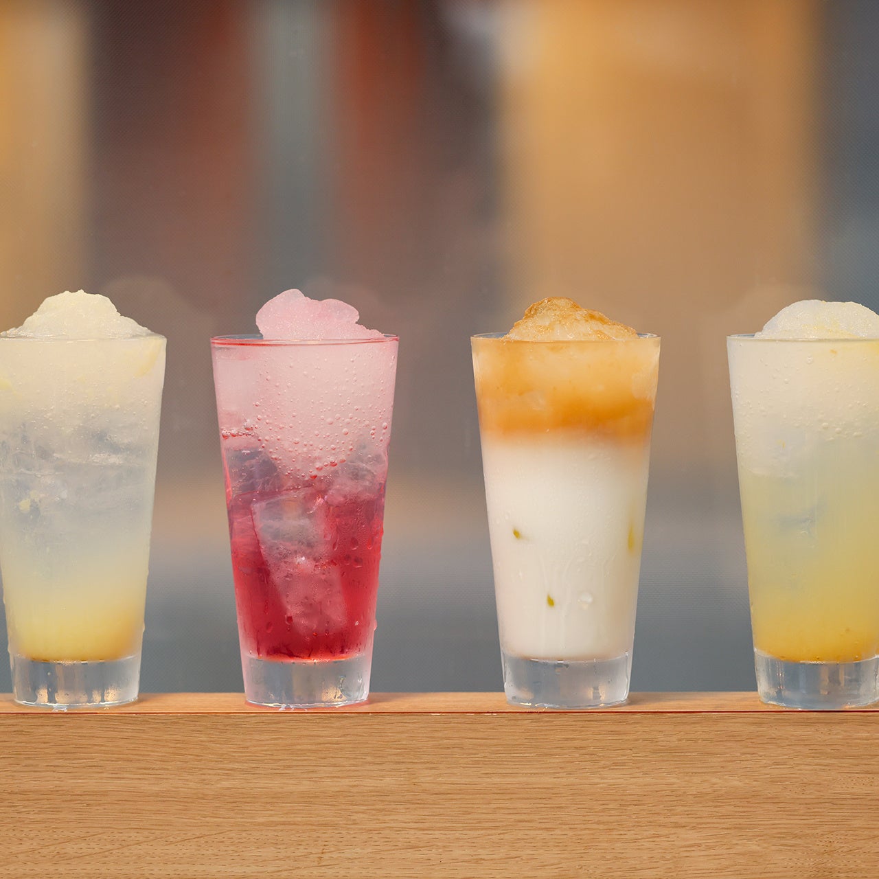 ドリンクは、フローズンをたっぷりのせ、レモンやジンジャーの自家製シロップを使用した「みぞれサワー」が名物。「みぞれ純生レモンサワー」や「みぞれ辛口ジンジャーサワー」などが楽しめます。その他、パイナップルを大胆に半分使用した「えびせんのジャンボ生搾りパイナップルサワー」や「カムカムサワー」などをラインナップ。また、食事利用やお酒が飲めない方向けにソフトドリンクも充実させ、おいりソフトクリームをトッピングした「コーラフロート」や「キャラメル焙じ茶ラテフロート」などを取り揃えております。