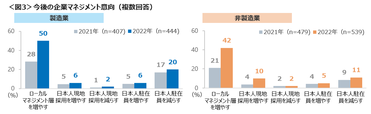 - 今後の企業マネジメントの意向は、製造業、非製造業ともに「ローカルマネジメント層を増やす」が大幅に増加