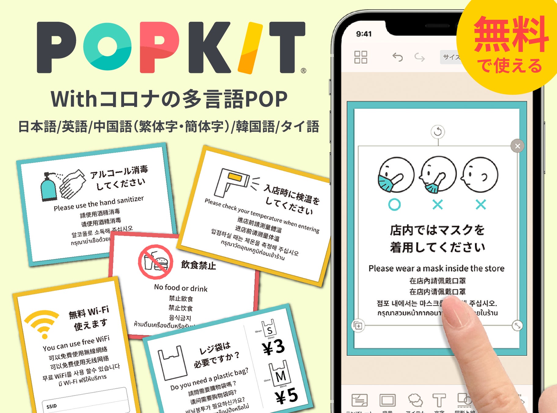 Withコロナの多言語POPが作れる素材を無料提供!カンタンPOP作成ツール「POPKIT」にて配信中。タイ語にも対応。