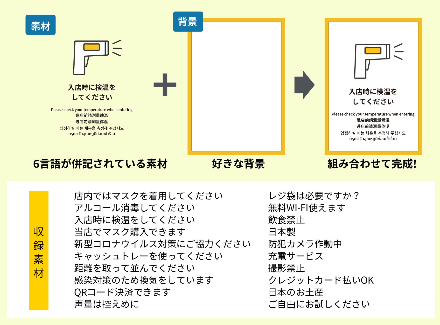 新型コロナウイルス対策の他、無料Wi-fiや決済サービス・充電サービスなど、 外国人観光客への様々な案内に使える素材を収録しています。 テンプレートそのままの利用はもちろん、5万点以上ある POPKITの豊富な素材を組みあわせ、自店に合ったデザインや内容に自由にアレンジすることができ、オリジナル多言語POPの作成が可能です。