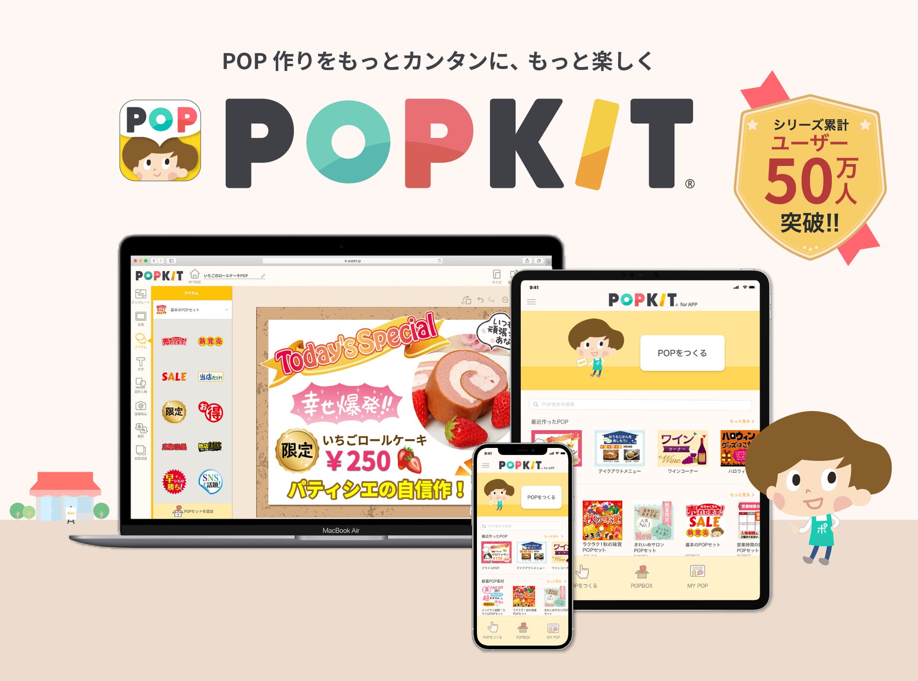 店舗のPOPやチラシが手軽に作成できる「POPKIT」は、シリーズ累計50万人以上のユーザーが利用するPOP作成ツール。あらかじめ入っているPOP素材をスタンプ感覚で組み合わせるだけで、デザインが苦手な方でもクオリティの高いPOPを作ることができます。パソコン(WEB)・iPhone/iPad(アプリ) で、無料から利用することができます。