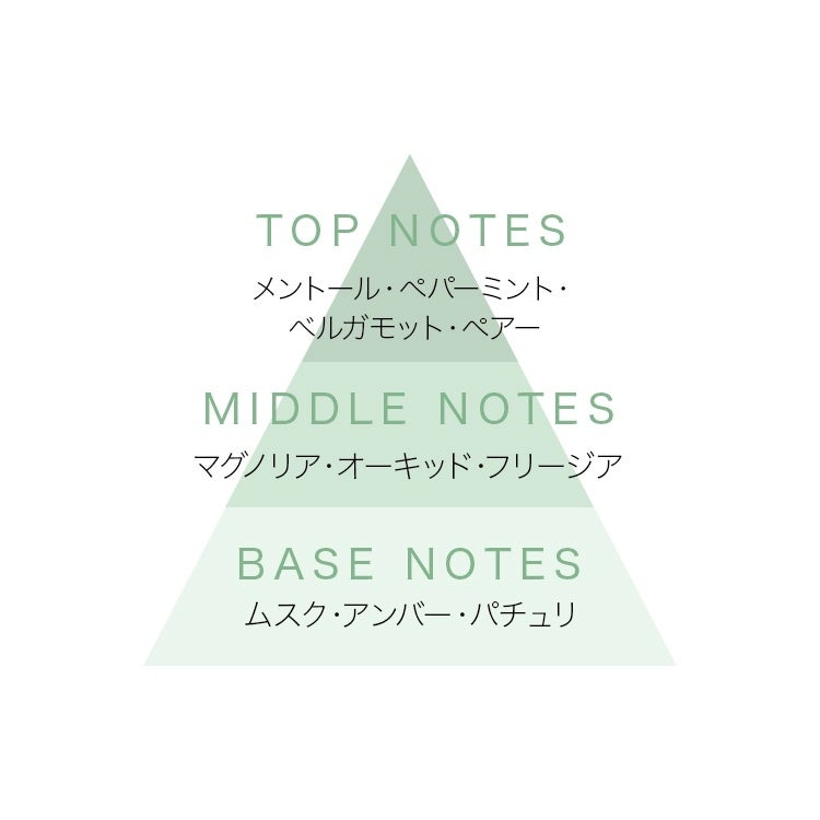 ペパーミント、メンソール、ペアーの爽快なノートと、フリージア、オーキッド、マグノリアの優しいフローラルノートの組み合わせが特徴で、洗練されたムスクとアンバーが香りを完成させます。
