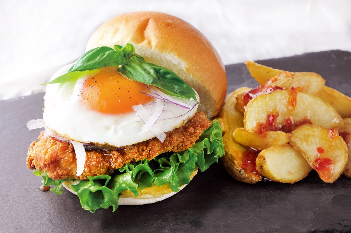 サクサクジュージューなフライドチキンに香り高いフレッシュバジルと特製ガパオソースを合わせました!目玉焼きも添えて、タイの家庭料理を再現したスパイシーなバーガーに仕上げています。付け合わせのフライドポテトは、しっとりと上品な甘みのある北海道産のブランド芋「マチルダ」を使用しチリソースを合わせています。