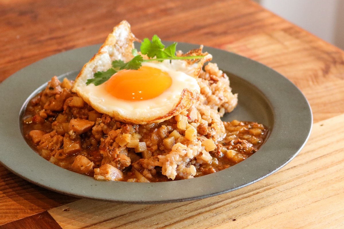 相性がいい卵をのせて食べるのもおすすめです。スパイシーな辛さと甘みに、卵をからめてお召し上がりください。