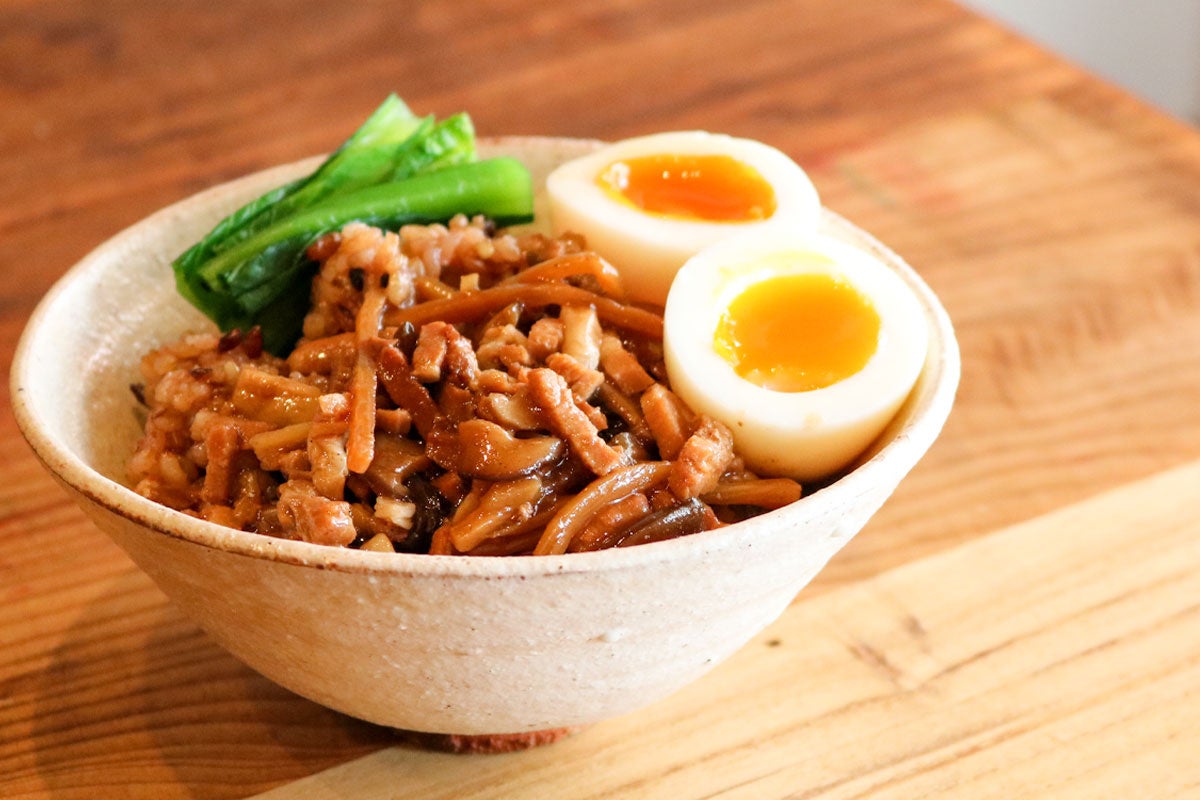 人気台湾料理のルーロー飯を本格的にアレンジ。中国の代表的なミックススパイスの五香粉を効かせることで、本場の味に近づけています。