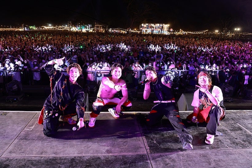 日が暮れ始めたステージに登場したのは、インパクト溢れるビジョンを背負ったDJ。圧倒的で力強いSolo Timeに誘われ多くの人たちが集まり始めたことを合図にしたように陽が落ち、どっぷりと暗くなった瞬間、勢いよく4人が登場。会場からは大きな歓声が溢れ、次々と人たちが集まってくる。