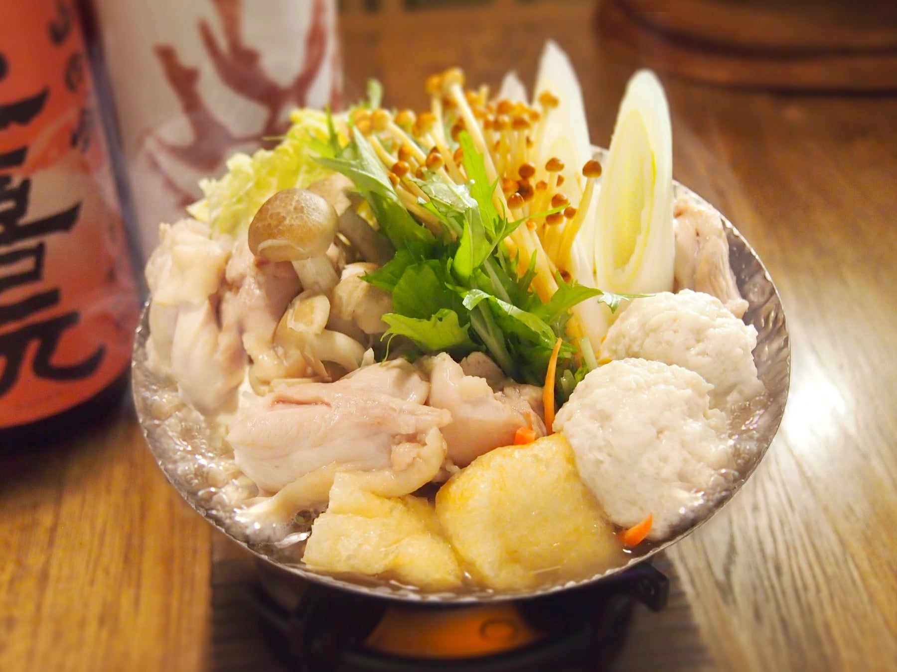 ■ソップ鍋 1‐2人前 1920円 ドメのソップ鍋は、名古屋コーチンと鰹だしをブレンドした上品なスープに、三河錦爽鶏や地野菜をふんだんに使用し、濃厚でコクのあるスープが特徴。ちなみに、「ソップ」はもともとオランダ語でスープという意味。そこが転じて相撲界では、鶏がらの出し汁と醤油などで味付けした一種のちゃんこ鍋のことを指すように。ドメはそのソップ鍋をさらにプロの味にブラッシュアップしています。