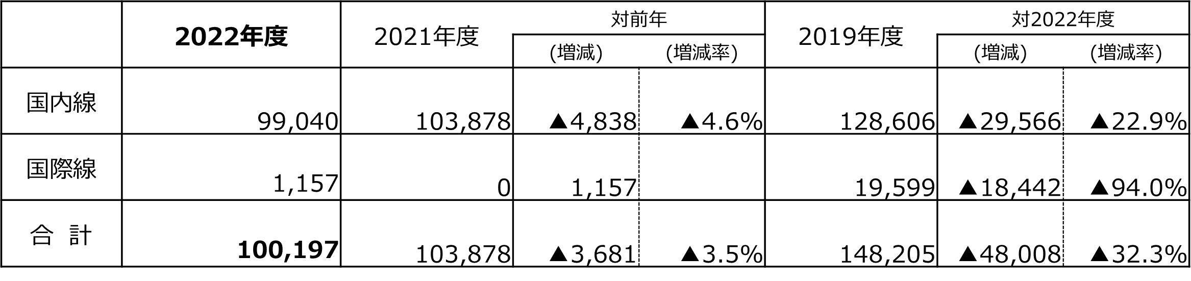 集計期間の始めと終わりの旅客数が低調に推移したことが主な要因となり、昨年度の実績をやや下回った。一方、3年ぶりに行動制限のない年末年始になったこと、約2年9か月ぶりとなる国際線チャーター便が運航されたことにより、コアとなる12月28日~1月3日では昨年度の実績を上回った。国内線におけるコロナ禍前2019年度の比較では、8割弱の水準まで回復した。