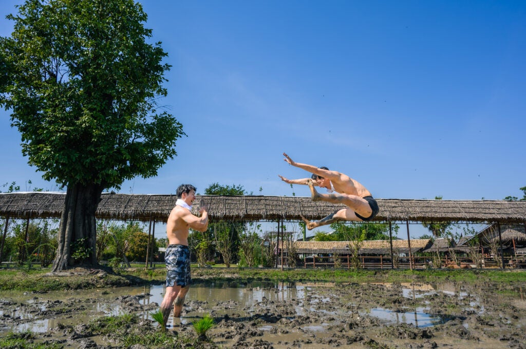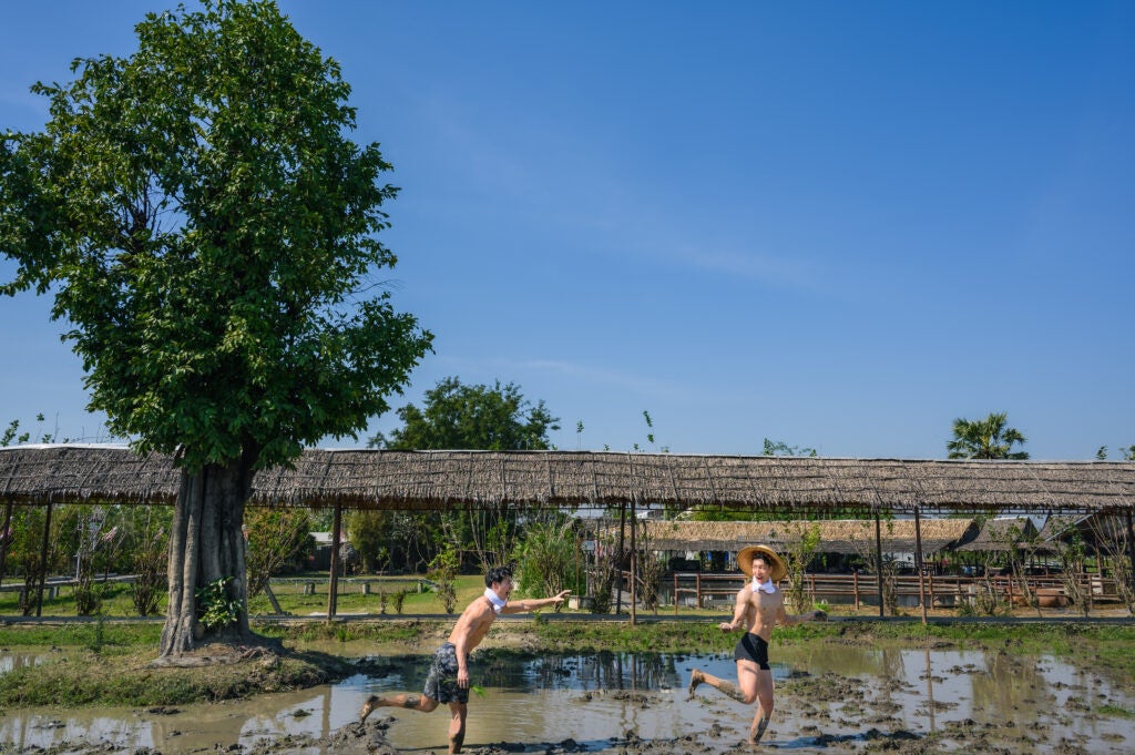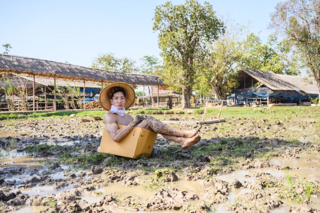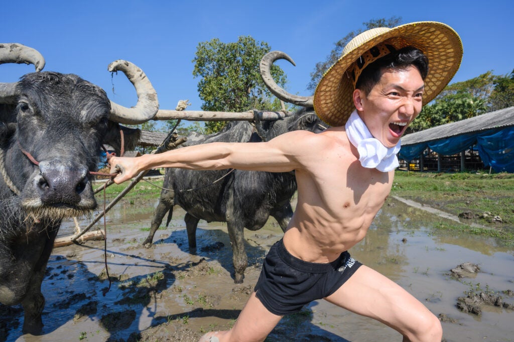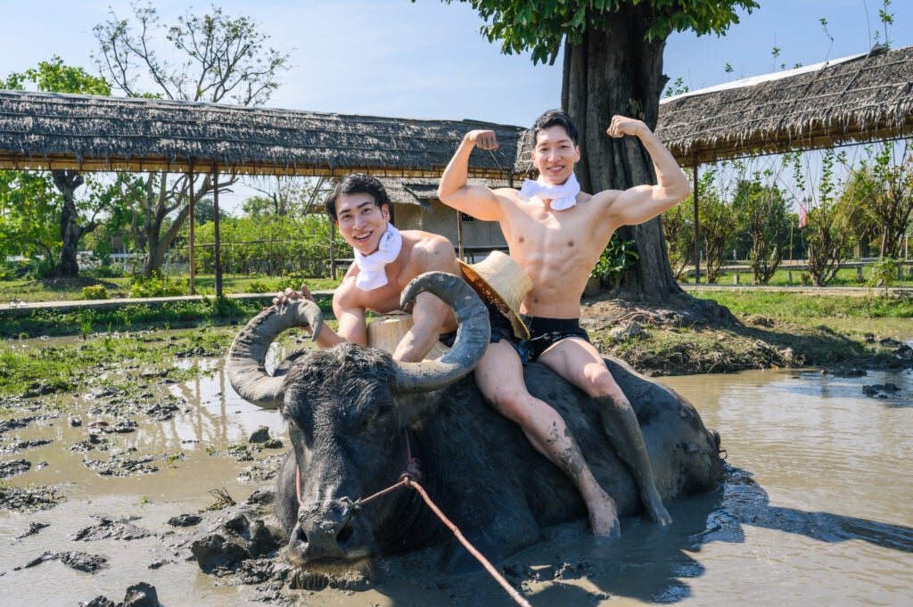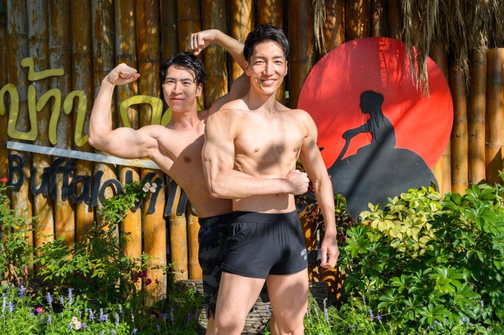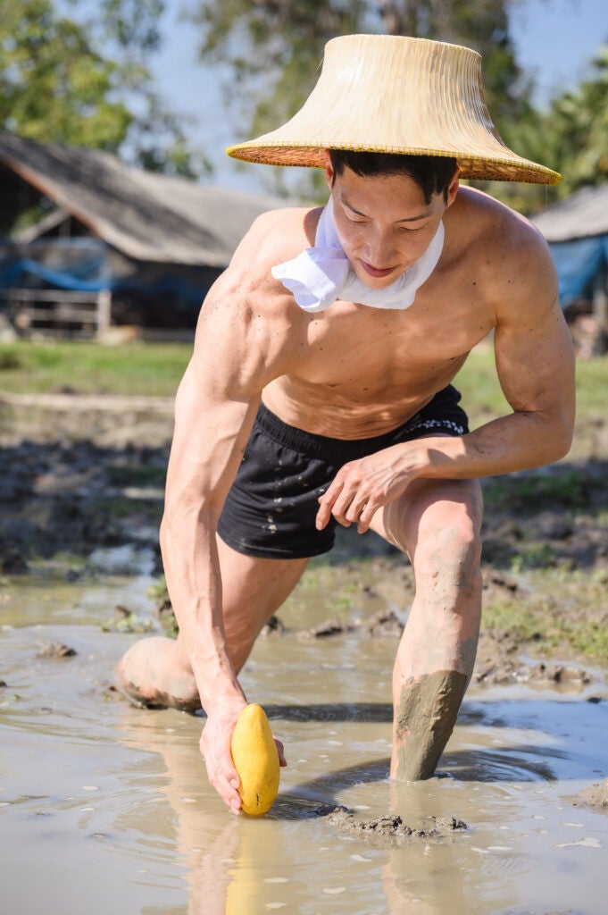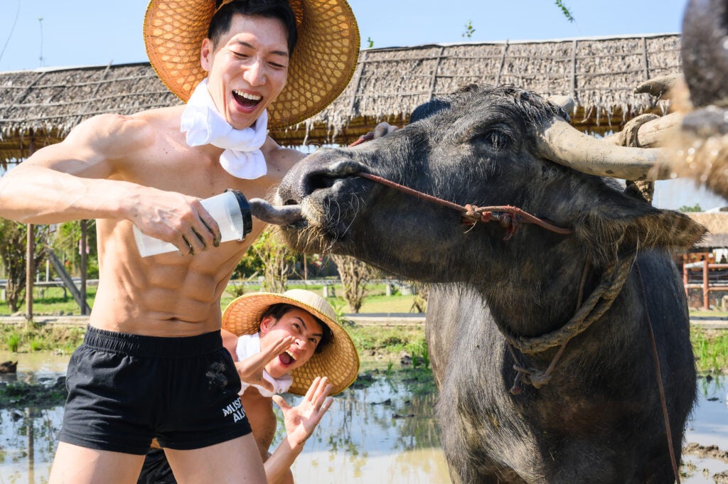 泥まみれになって田植えをするマッチョ、水牛と戯れるマッチョ、田んぼに捨てられるマッチョ(?)など、日本のマッチョたちがタイでもコミカルな写真を撮影しフリー素材として提供致します。