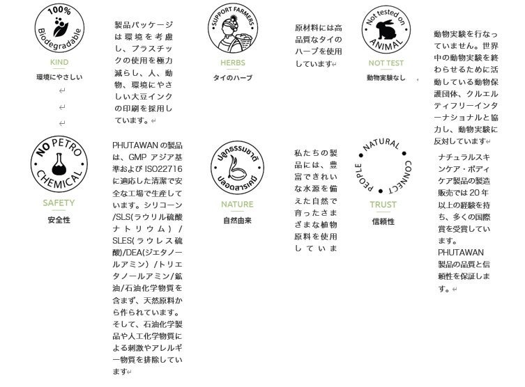 「PHUTAWAN」は、ハーブ、ナチュラルビューティ大国・タイで急成長中の自然派ウエルネスブランド。1999年の設立以来、「NATURAL CONNECT PEOPLE=自然と共存・共生する」をコンセプトに、提携農家と栽培から共同開発した有機栽培の植物原料や自然素材を使った、人にも環境にもやさしい製品を生み出しています。