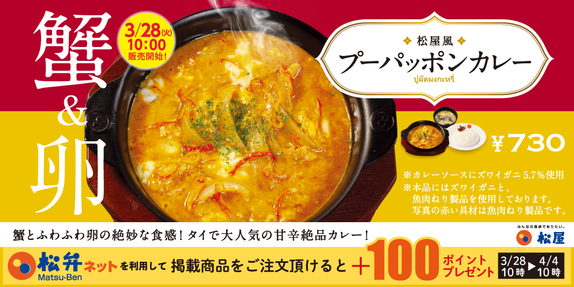 このたび松屋フーズ(本社:東京都武蔵野市、代表取締役社長:瓦葺一利)では、牛めし・カレー・定食・その他丼の「松屋」におきまして、2023年3月28日(火)午前10時より「プーパッポンカレー」を発売いたします。