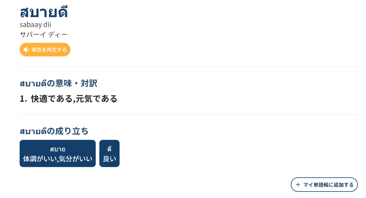 2つ以上の単語からなる複合語の成り立ちを表示することで、検索したタイ語がどのような単語から成り立っているのかが明確になり、意味や構造が理解できる仕様になりました。