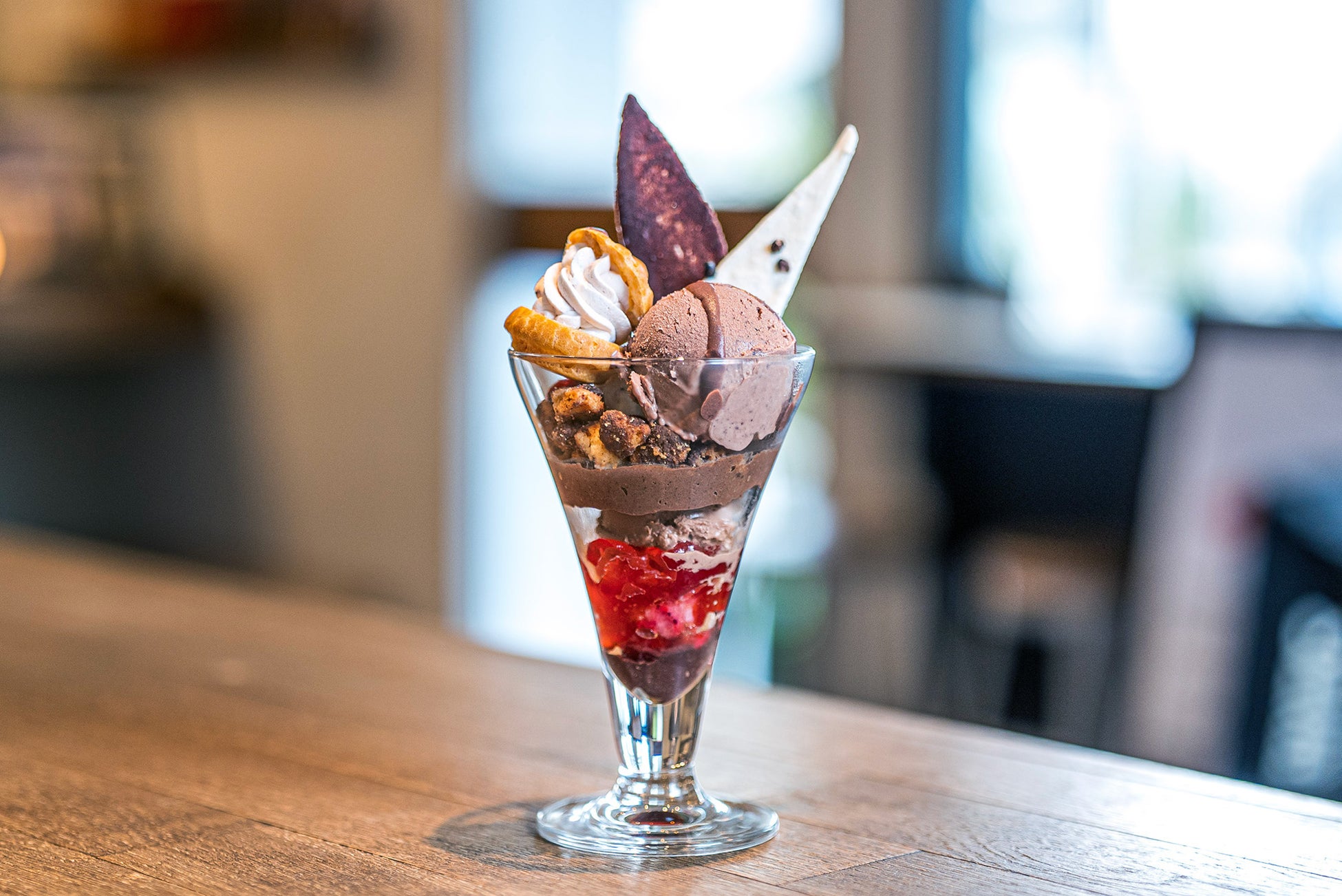 今季は香川県のいちご農家「いちご家めい」さんの希少ないちご“女峰”を、バジル香るいちごゼリーと、さらにシューのホイップとジャムにも贅沢に使った、チョコレートといちごを堪能いただけるパフェに仕上げました。