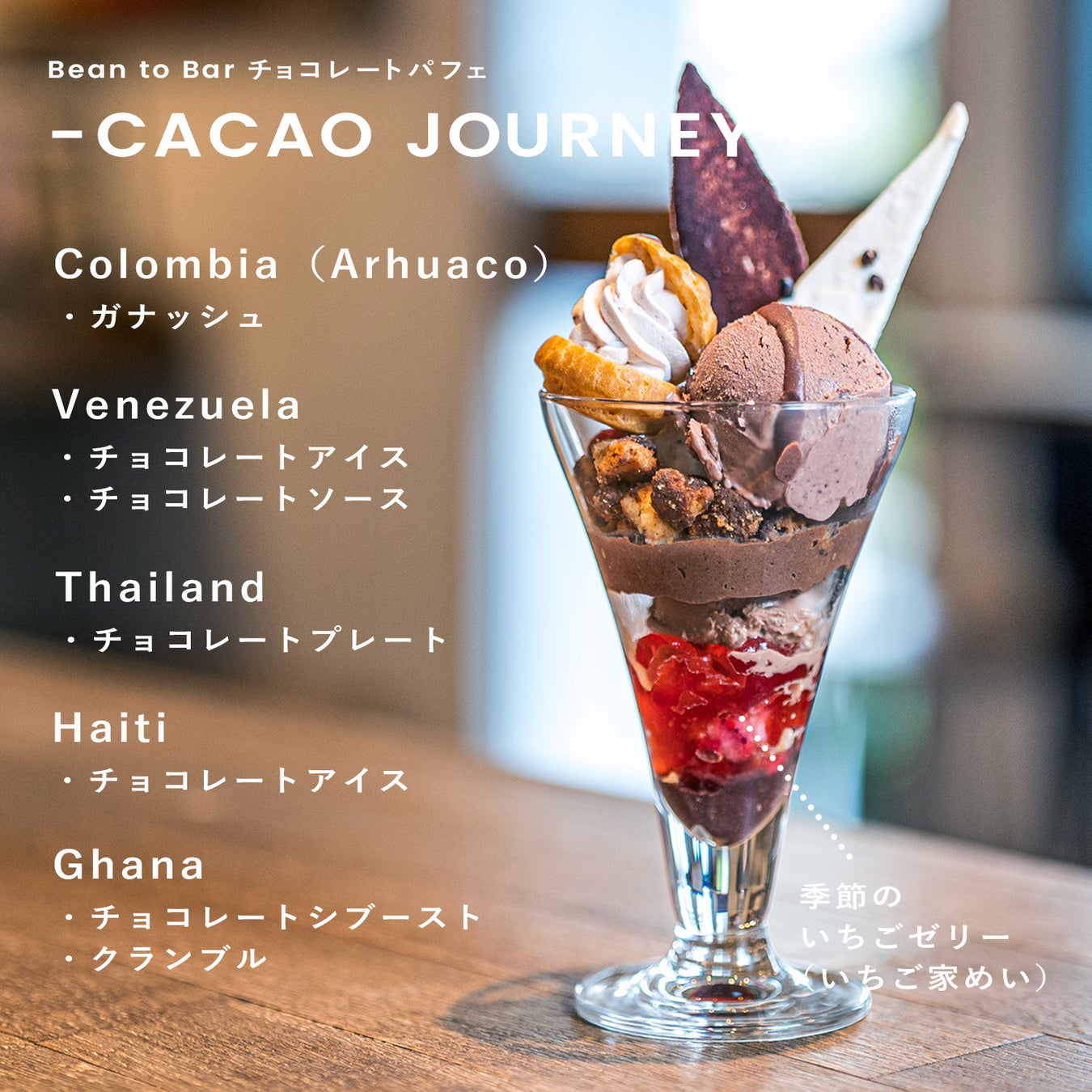 「Bean to Bar チョコレートパフェ -CACAO JOURNEY-」は、香り豊かな5カ国のカカオ豆からおつくりした7つのチョコレートパーツで、世界をめぐるようにチョコレートをお楽しみいただけるBean to Barチョコレート専門店ならではのパフェです。シーズンごとに季節に合わせたゼリーでご提供しています。