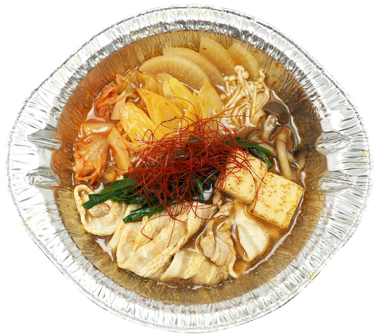 甘みのある三元豚バラ肉と韓国産ダシダを使用した、本格的な旨辛チゲです。豚肉をさっと火で炙ってから脂を逃さず鍋に取り込み、本場韓国の牛肉スープと旨味と辛味にこだわった本格白菜キムチで煮込みました。