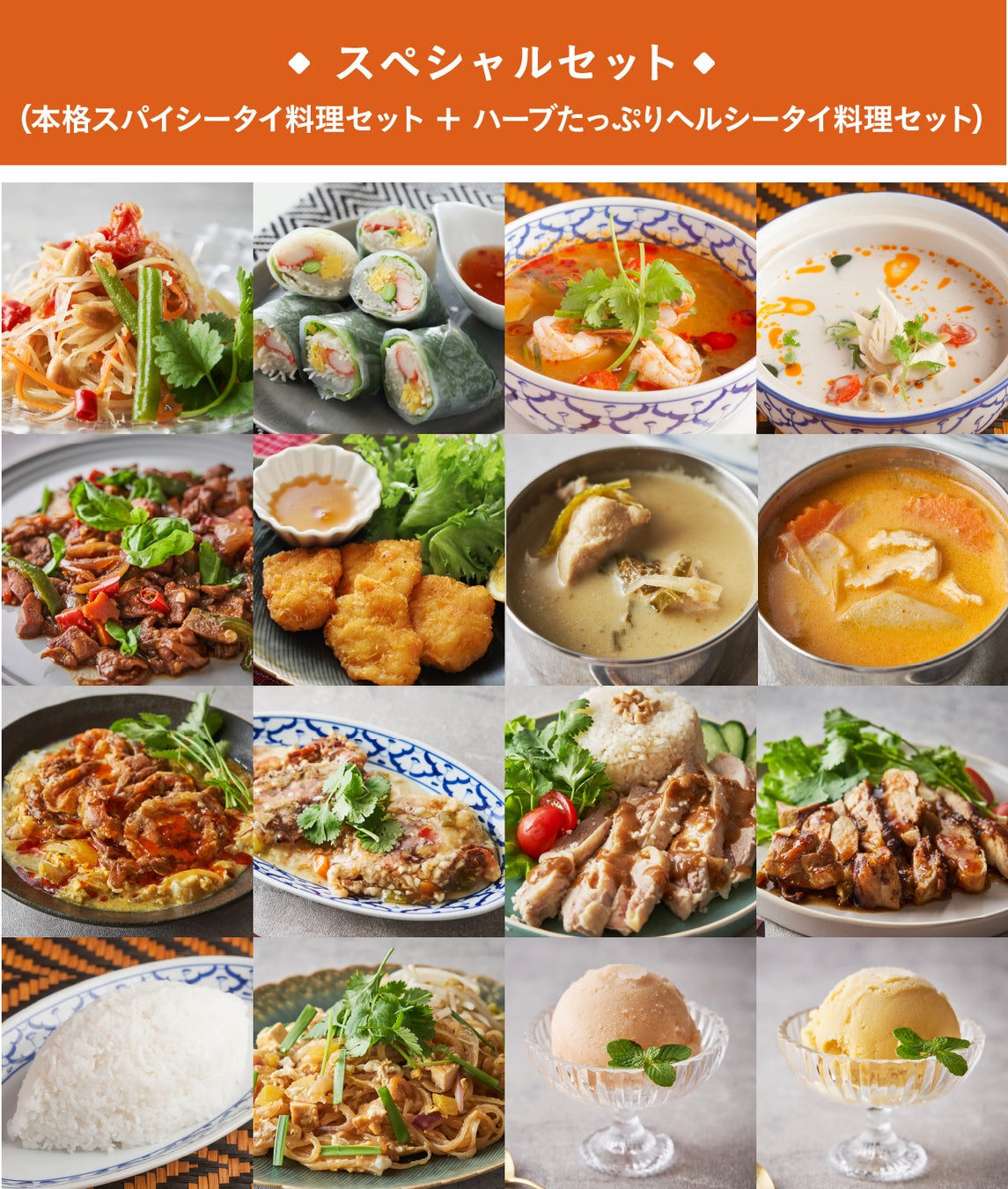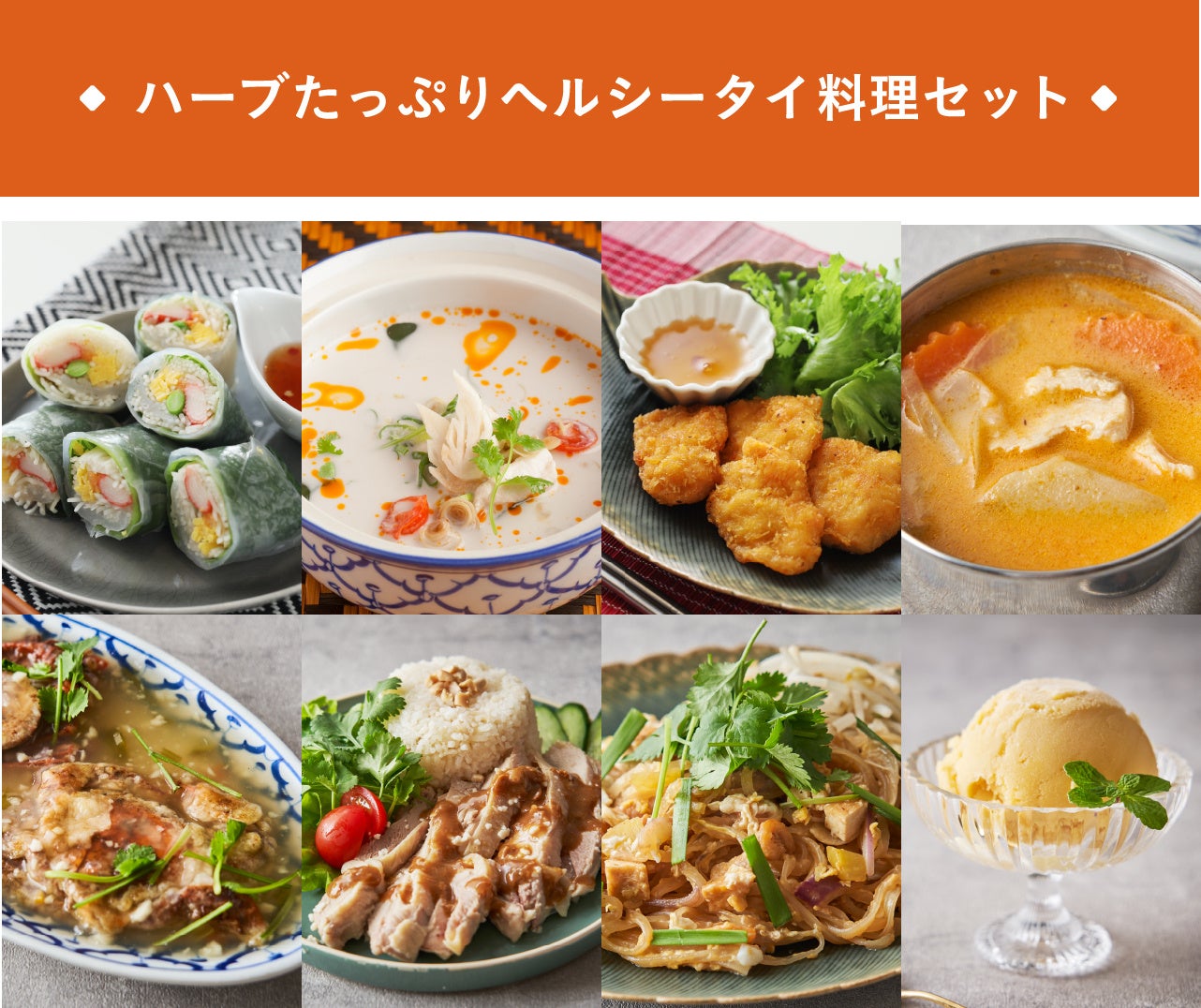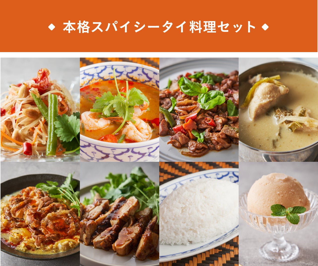 ◆青パパイヤサラダ ◆生春巻 3本 ◆海老のスパイシースープ ◆鶏肉のココナッツスープ ◆鶏肉のタイバジル炒め ガパオ ◆海老のすり身揚げ ◆鶏肉のグリーンカレー ◆鶏肉のマッサマンカレー ◆ソフトシェルクラブの卵カレー炒め ◆ソフトシェルクラブのニンニク炒め ◆蒸し鶏ご飯 ◆鶏肉のタイ風ステーキ ◆ジャスミンライス 2合 ◆パッタイ ◆グアバシャーベット 2カップ ◆パパイヤシャーベット 2カップ