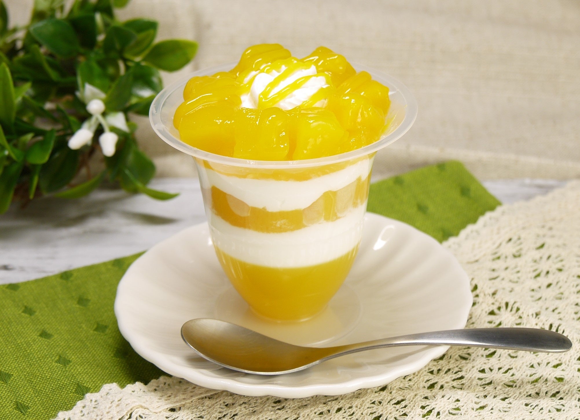ジューシーなマンゴーゼリーにさっぱりとした味わいのヨーグルトムースを重ね、中間層と上部にたっぷりのタイ産マンゴーをトッピングした、初夏にぴったりのマンゴーパフェです。果肉とボリュームがたっぷりのパフェをお楽しみいただけます。