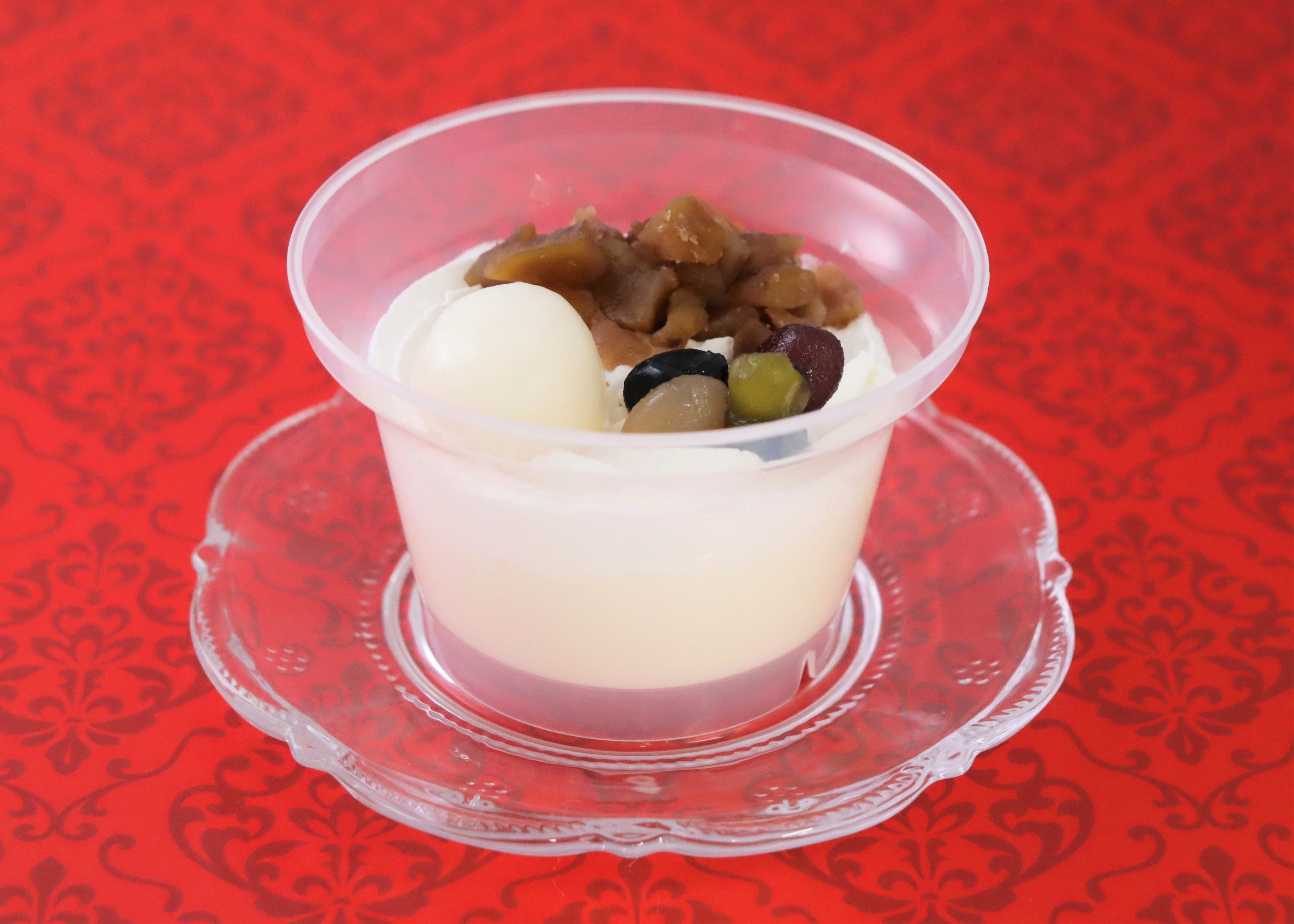 ココナッツの香りが特長のミルクプリンに、豆、白玉、栗かのこをトッピングしています。「ボボチャチャ」の本来の意味である「ごちゃ混ぜ汁粉」の通り、そのまま食べても、ごちゃ混ぜにしても美味しくいただけるスイーツに仕上げています。